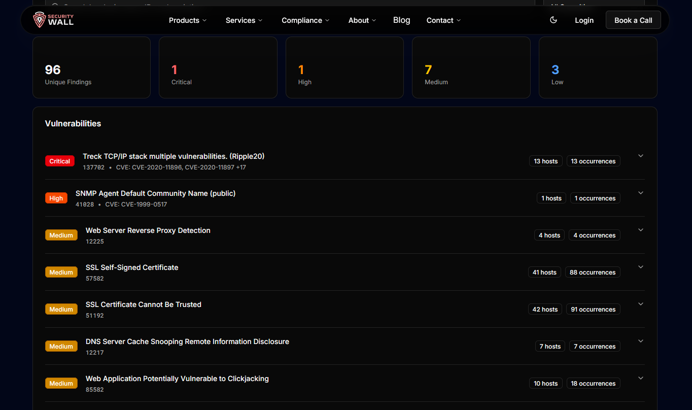 With the SecurityWall Nessus Report Visualizer, teams can turn raw, overwhelming Nessus data into actionable intelligence instantly. Combined with our pentesting services and SLASH platform, organizations gain a complete view of their security posture while saving hours of manual work.