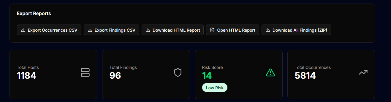 Export flexibility is built in. Findings can be exported as CSV for tracking, HTML for print-ready reports, Markdown for documentation, or ZIP archives for full offline analysis. These exports integrate cleanly with internal reporting workflows and client deliverables.