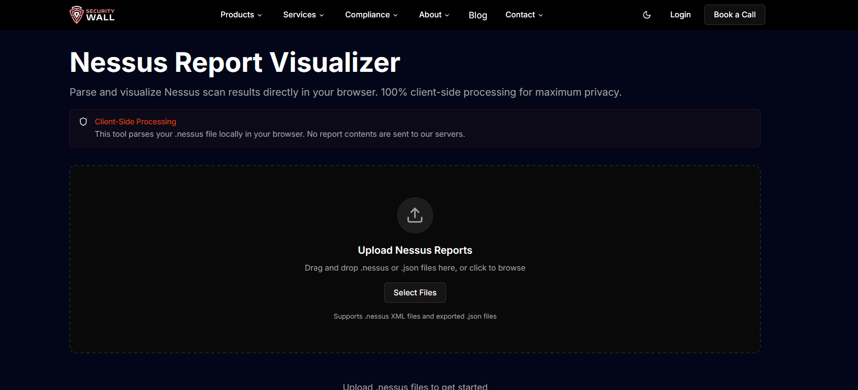 The SecurityWall Nessus Report Visualizer processes everything locally in the browser. There is no server upload, no storage, and no logging of scan data. This design aligns with security expectations in regulated environments and high-risk industries.