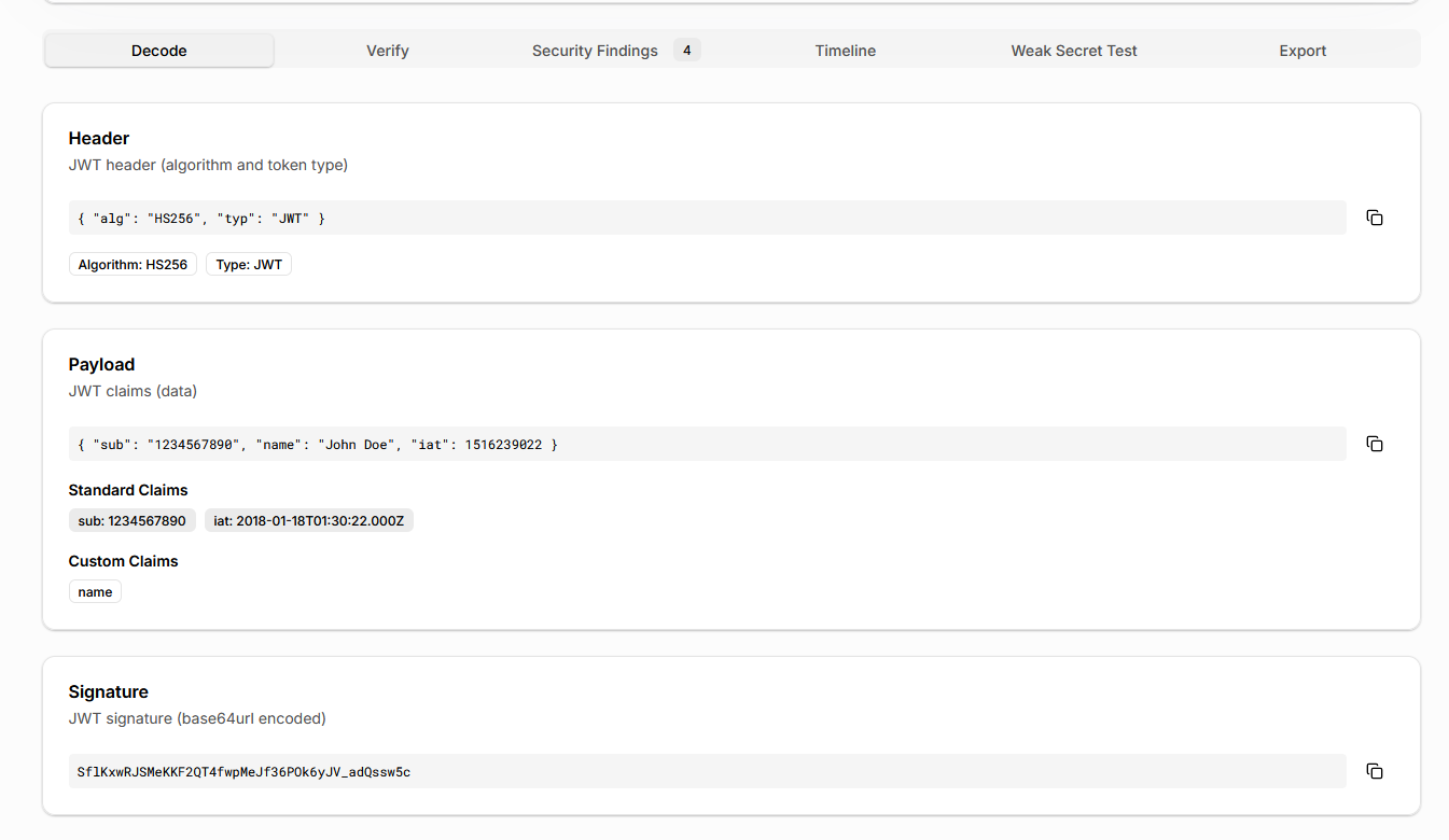 This makes it easier to spot two common issues: missing security-critical claims and unintended data exposure in the payload. In real security assessments, sensitive application data embedded in JWT payloads is a frequent and overlooked risk.