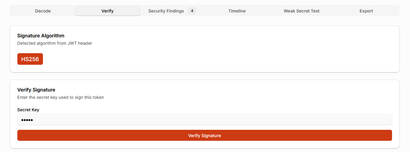 A proper JWT security checker must confirm that the token signature is cryptographically valid. The SecurityWall JWT Analyzer detects the signing algorithm declared in the JWT header and requires the correct secret or public key to perform verification.