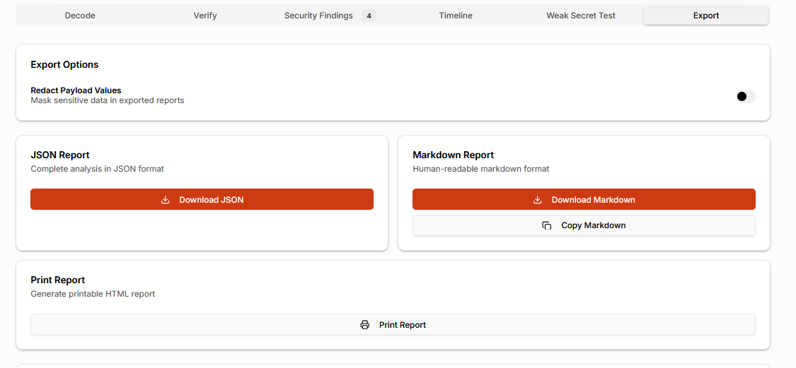 The SecurityWall JWT Analyzer supports exporting findings in formats suitable for real workflows, including structured data for automation and readable reports for security reviews and assessments. Sensitive payload values can be redacted during export to avoid leaking authentication data.
