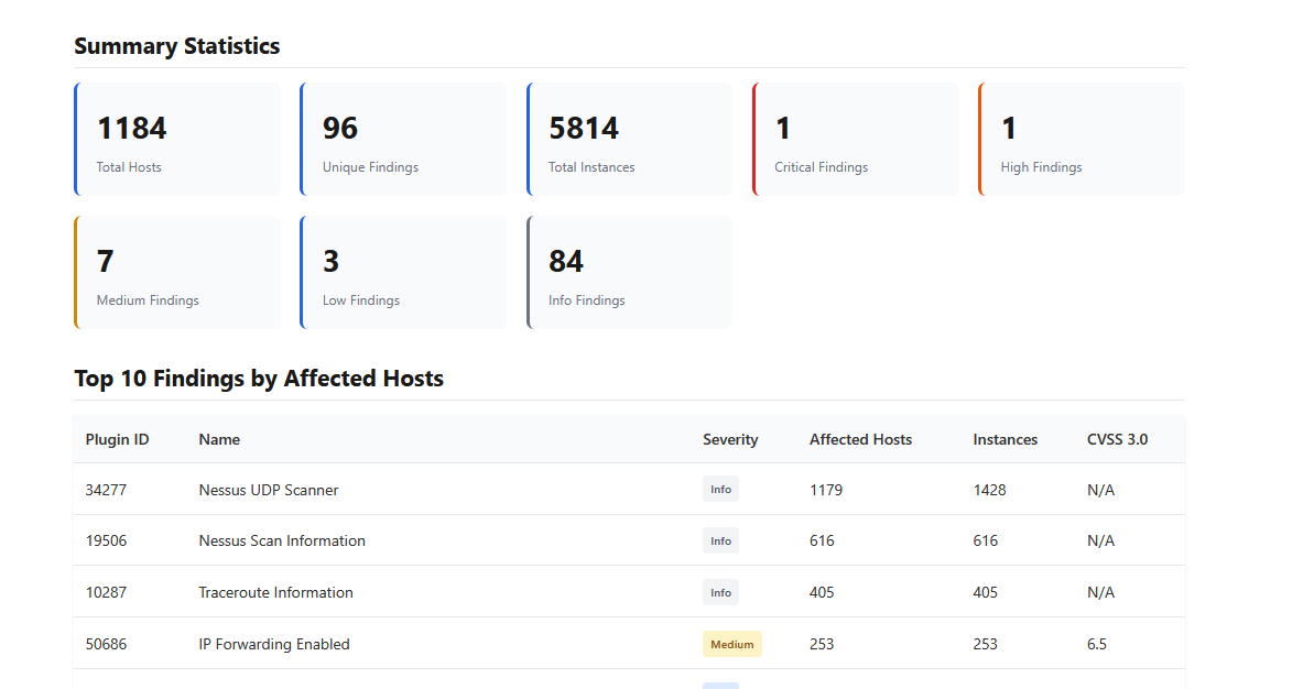 Turn raw Nessus XML & CSV reports into clear, visual insights in minutes.