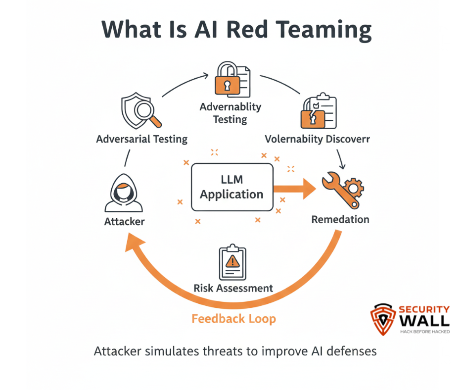 AI red teaming is the practice of simulating adversarial attacks against AI systems including LLMs to uncover vulnerabilities before malicious actors do. It is a proactive security discipline that goes beyond typical testing to challenge safety controls, simulate real attack pathways, and assess how resilient an AI application is to adversarial input.