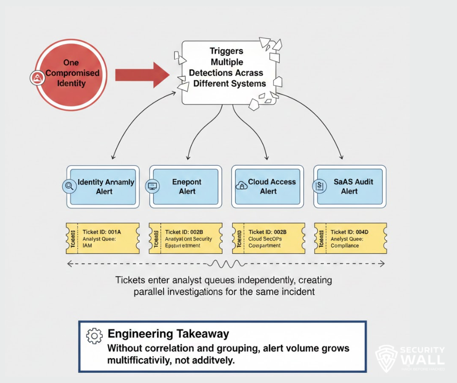 Duplicate detections across tools generate parallel tickets for the same underlying behavior. Analysts spend time correlating instead of responding.