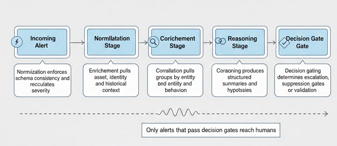 Between alert generation and human handling sits an intelligence pipeline. This pipeline transforms noisy signals into actionable security context.